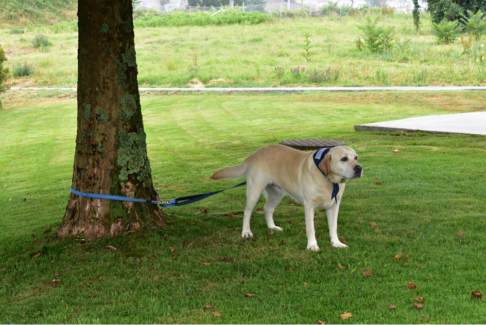 À chegada, a Mel sossegada aguarda os comandos da dona, presa com a trela à volta da árvore que dá sombra à realização da sessão. O sol também ajudou com um compasso de espera, fazendo com que o calor desse tréguas e tornasse a manhã mais fresca para esta terapia assistida por animais ao ar livre.